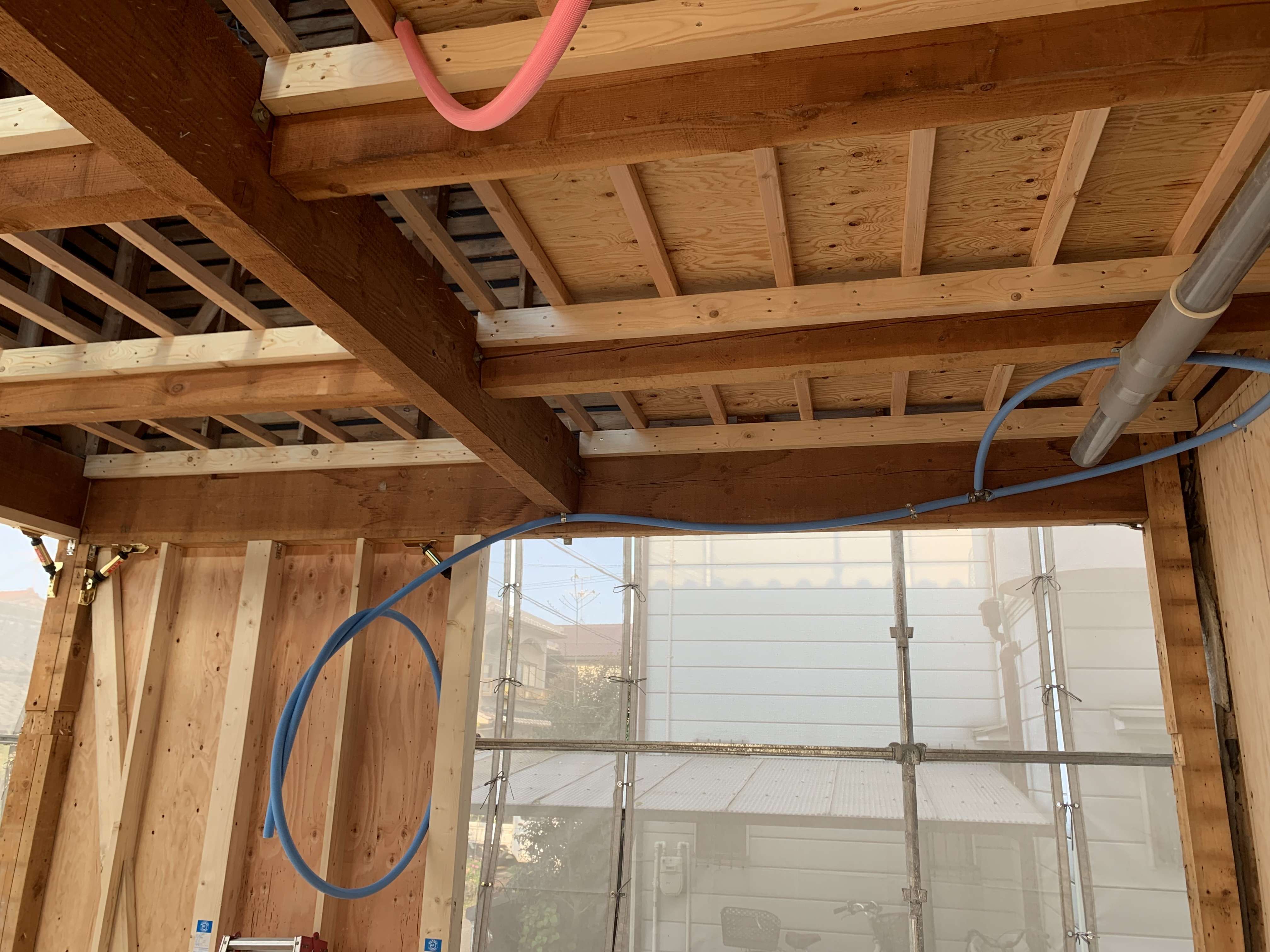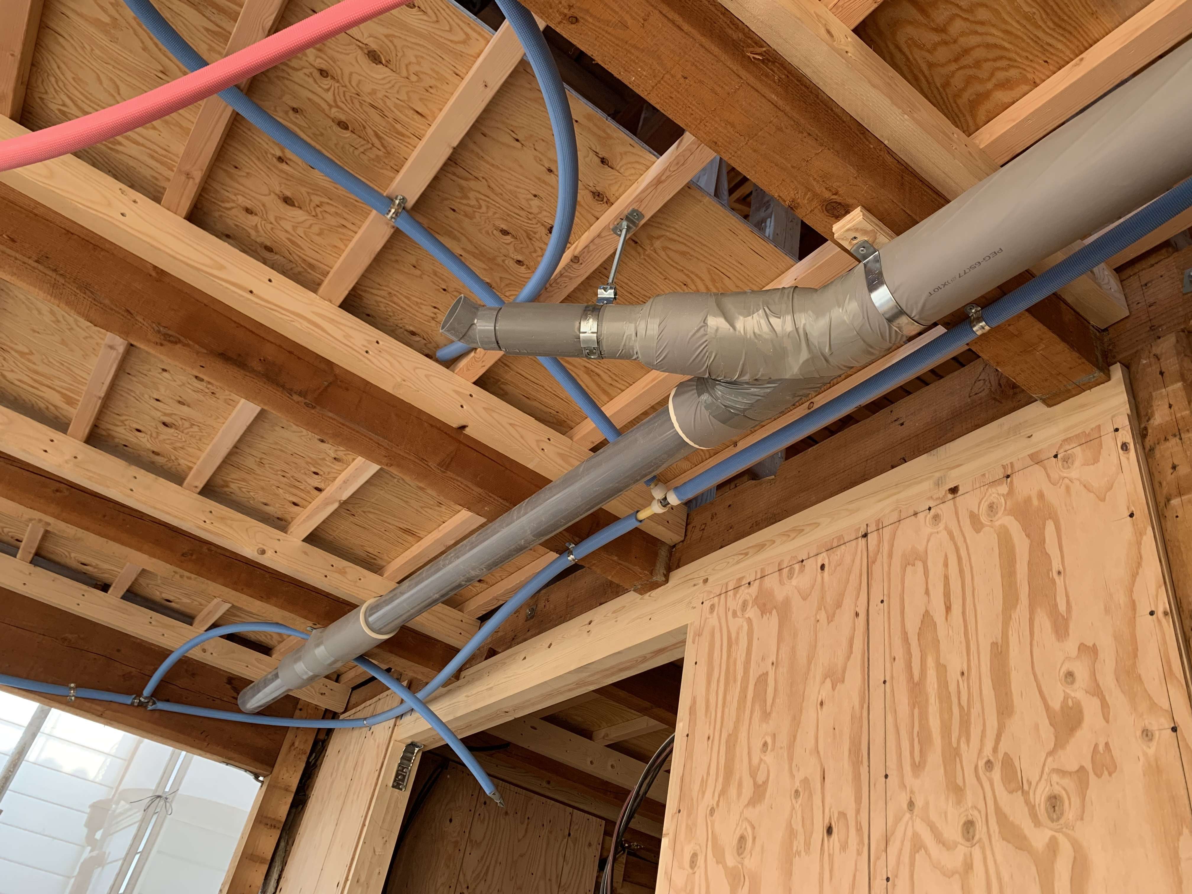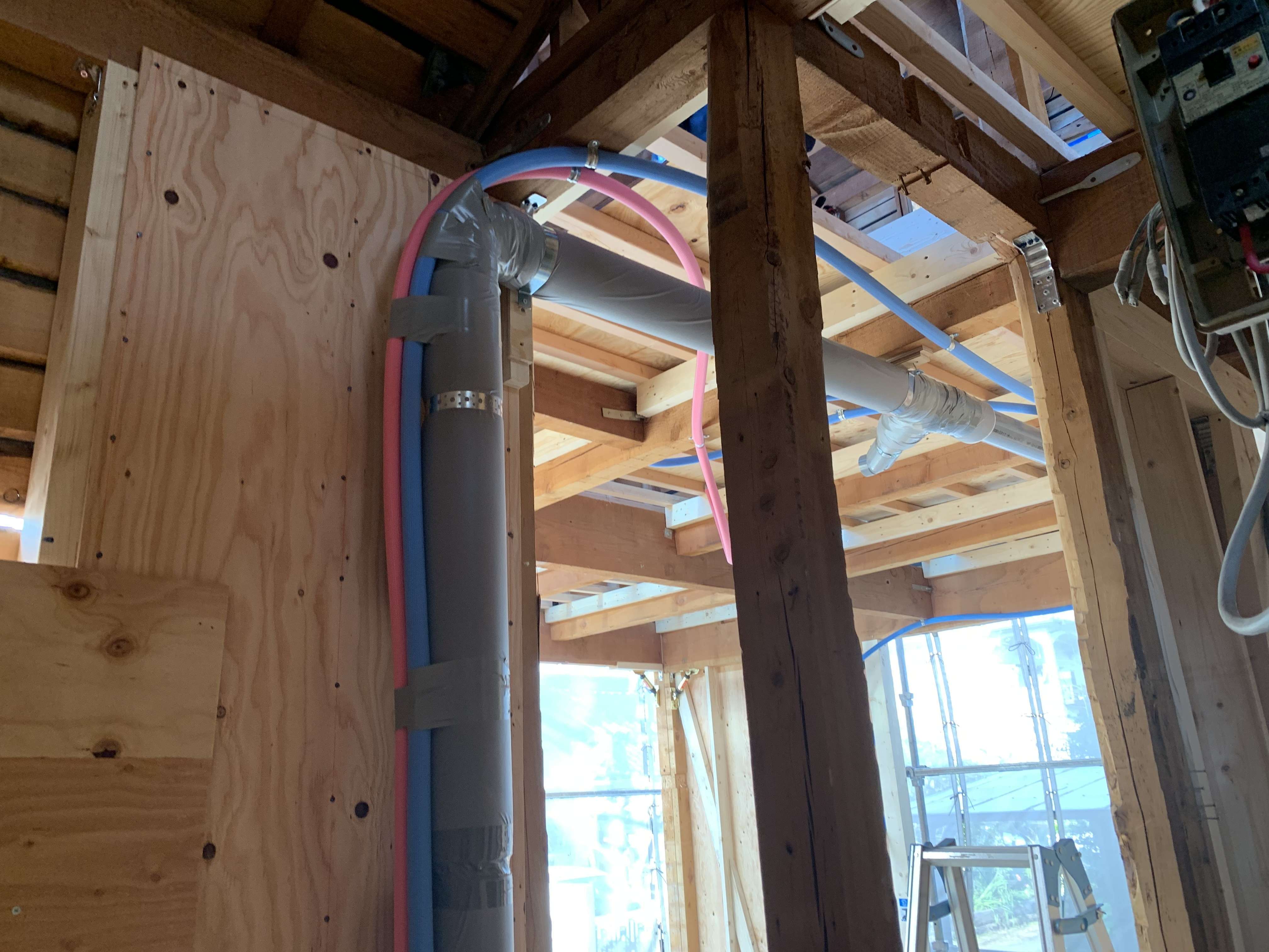 2Fの天井配管は大工さんが床を貼ってから仕込むので途中で止めておきました!