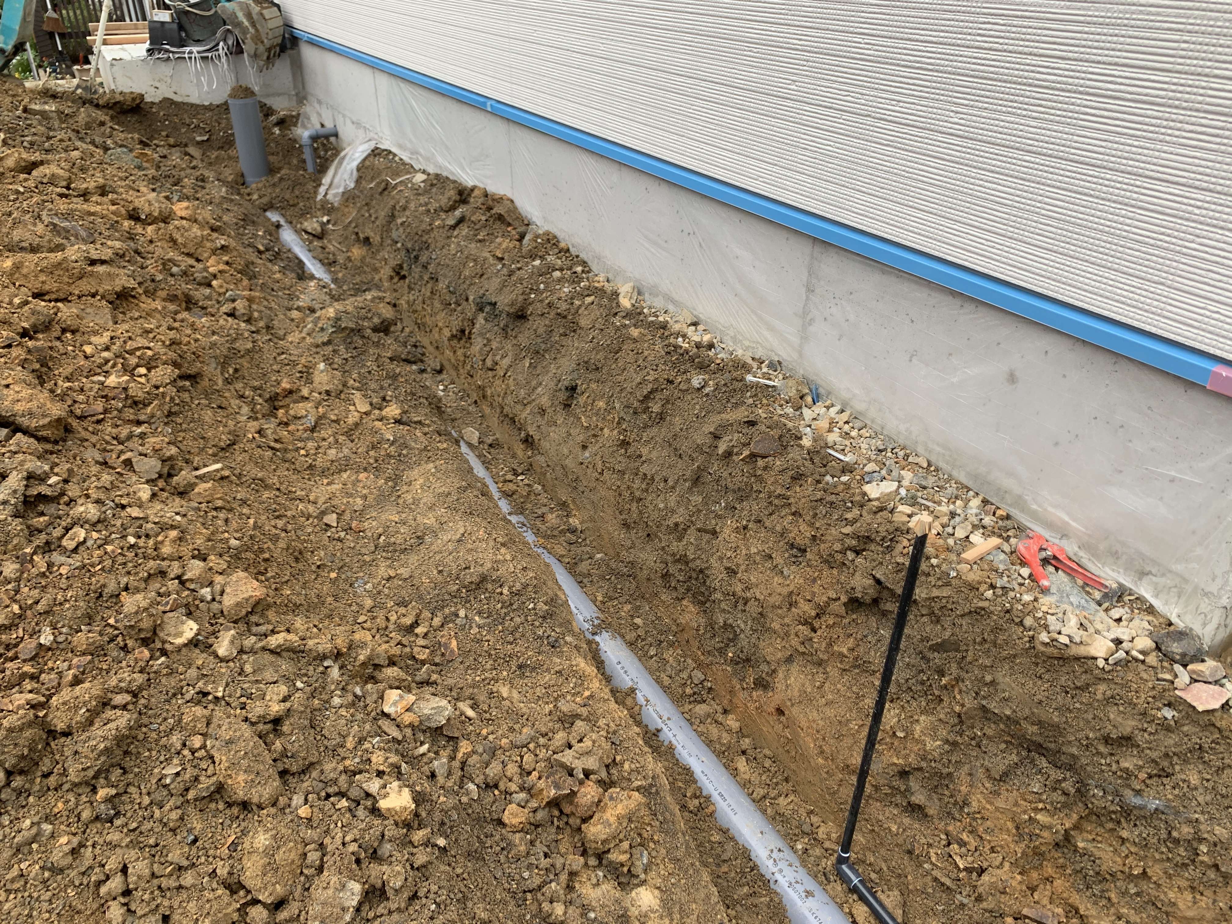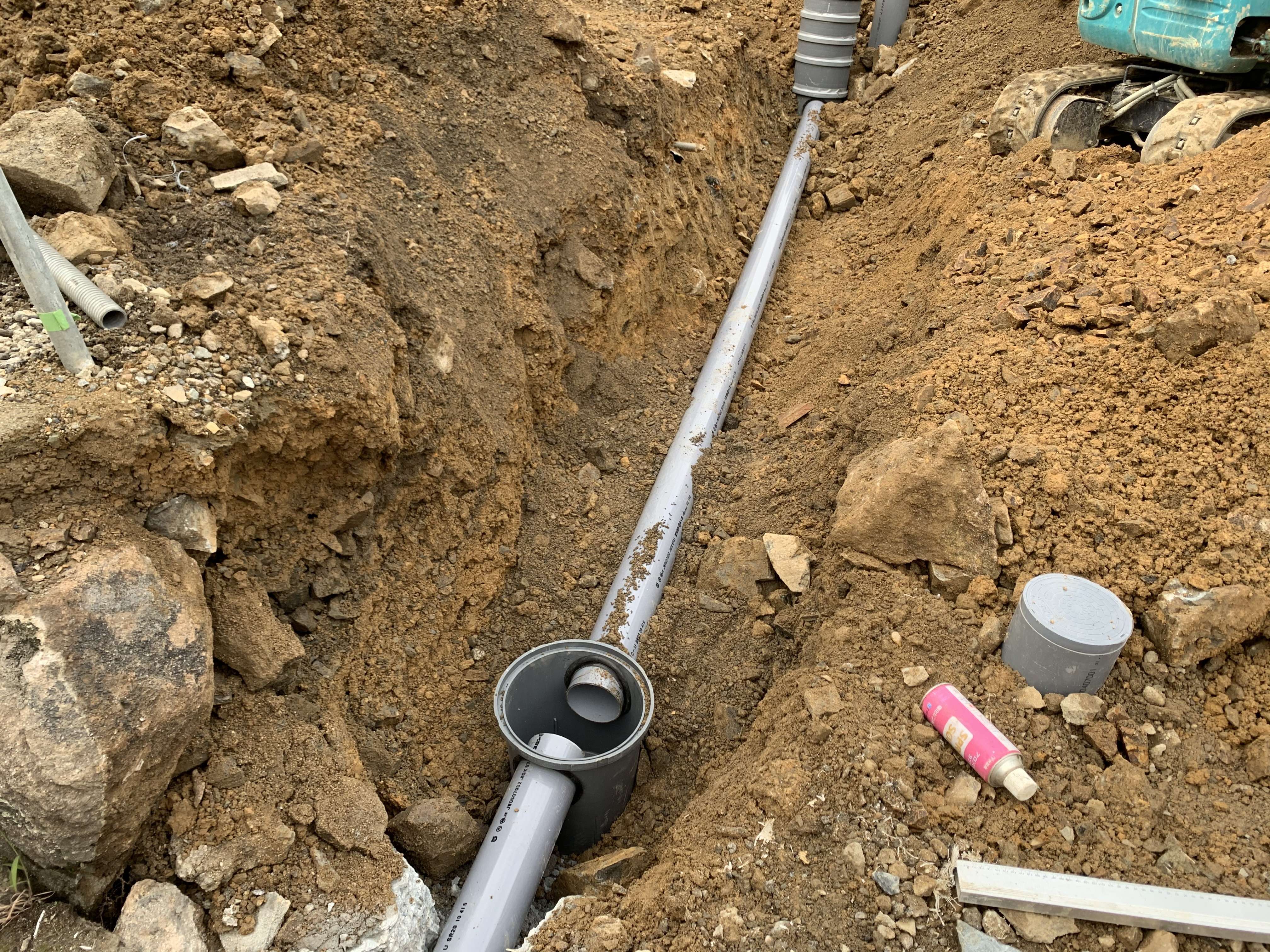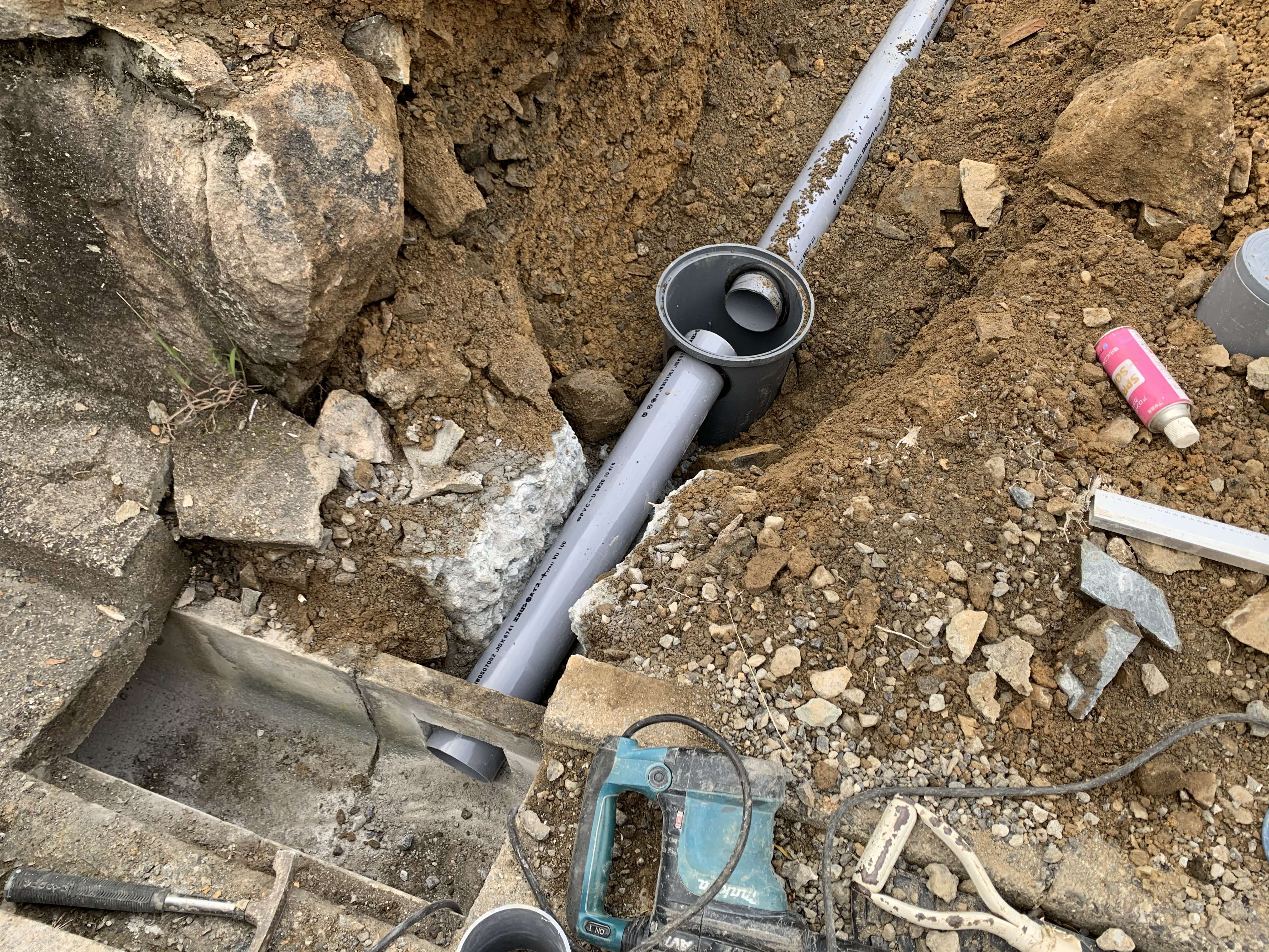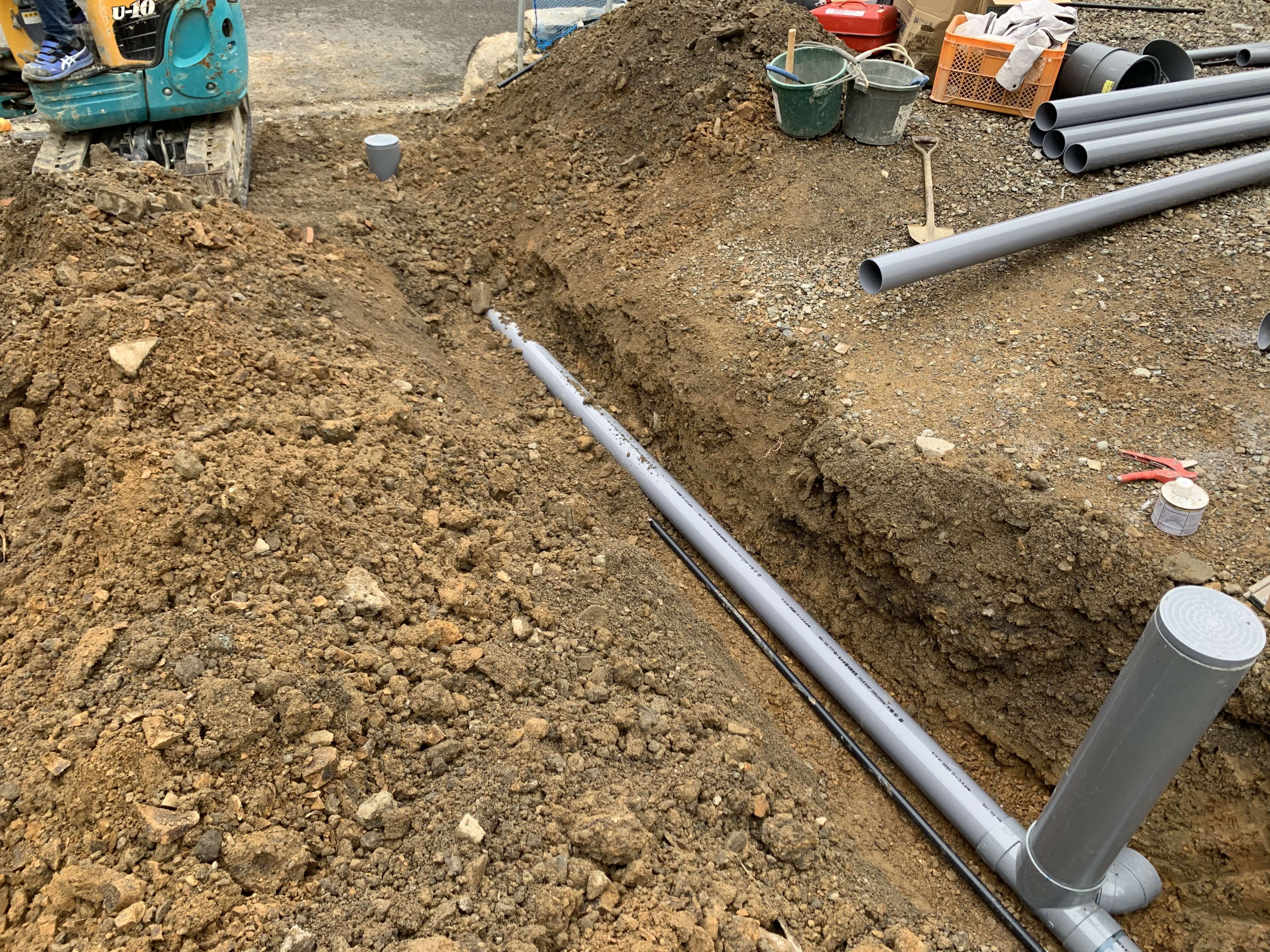 途中まで配管していた汚水の配管を最終桝に繋ぎ、雨水は側溝まで繋ぎ込みました!