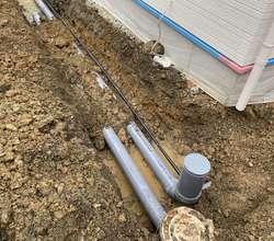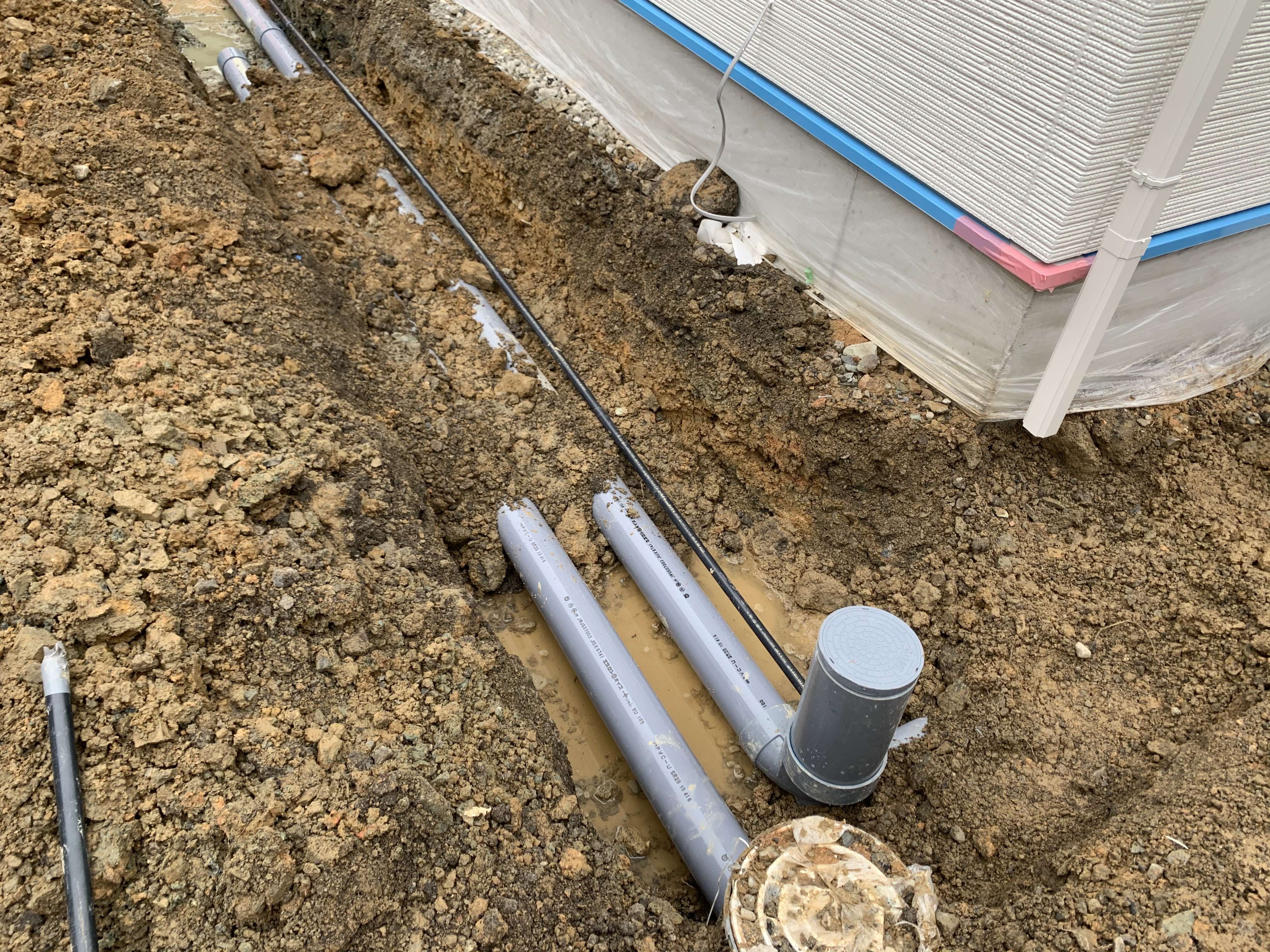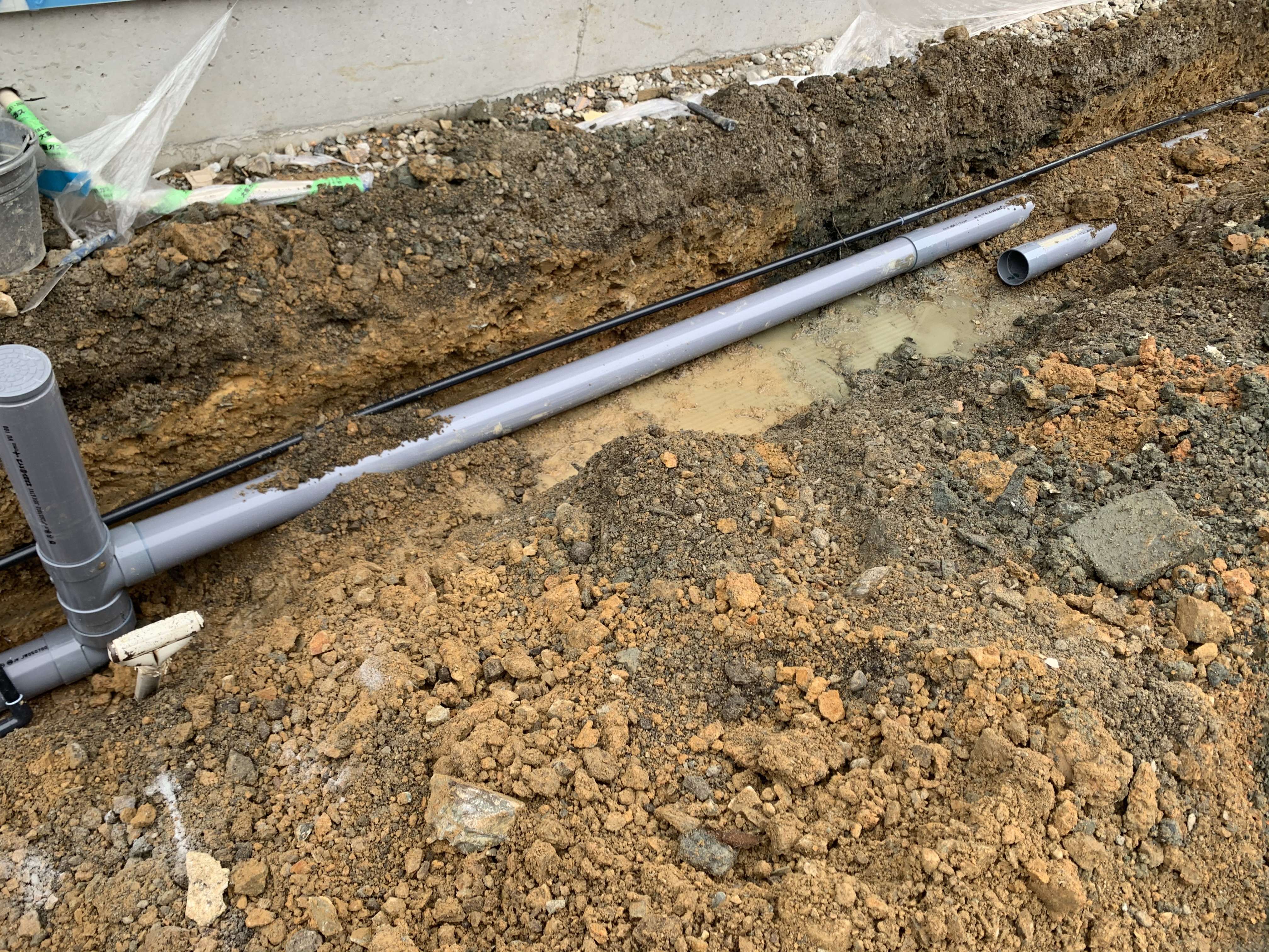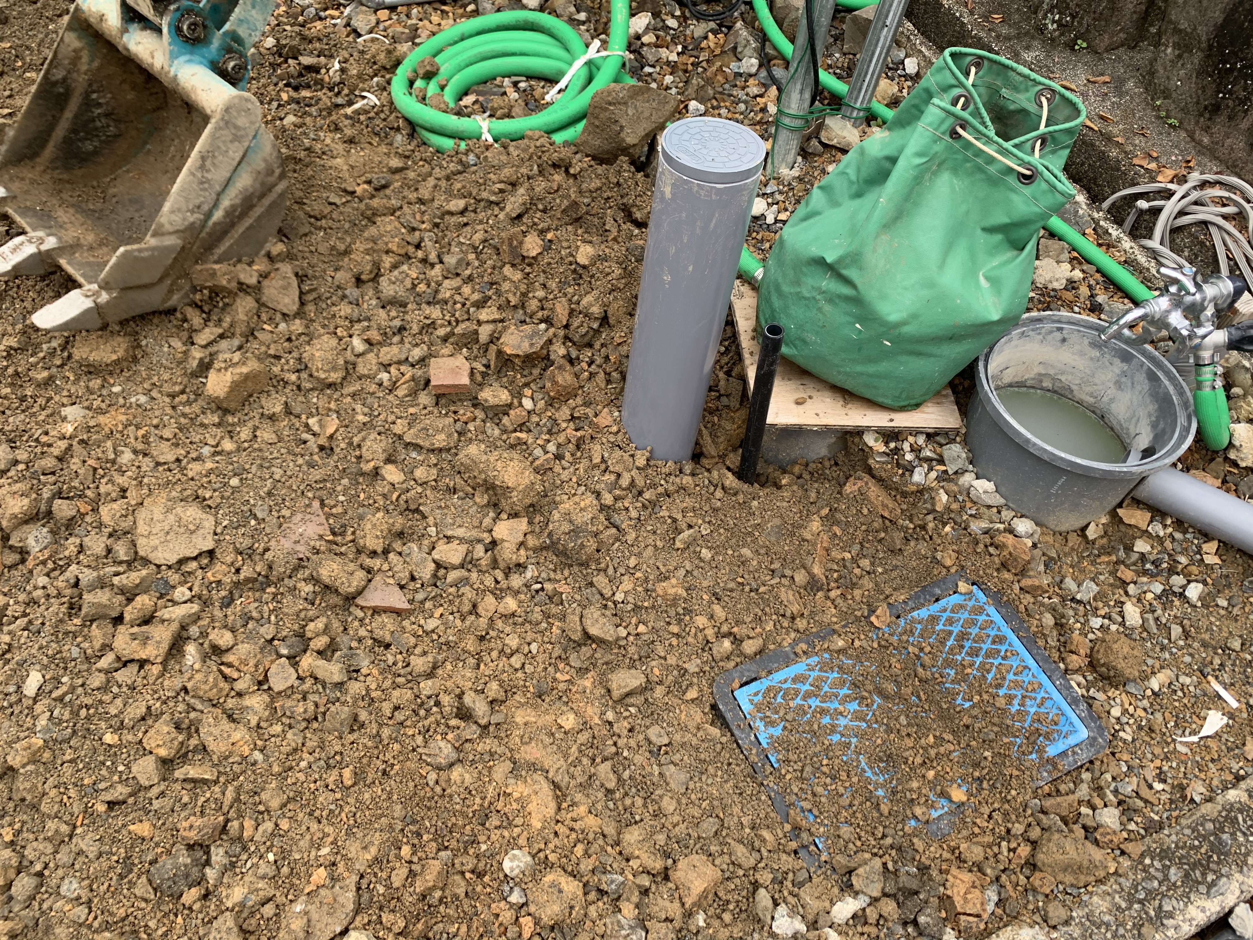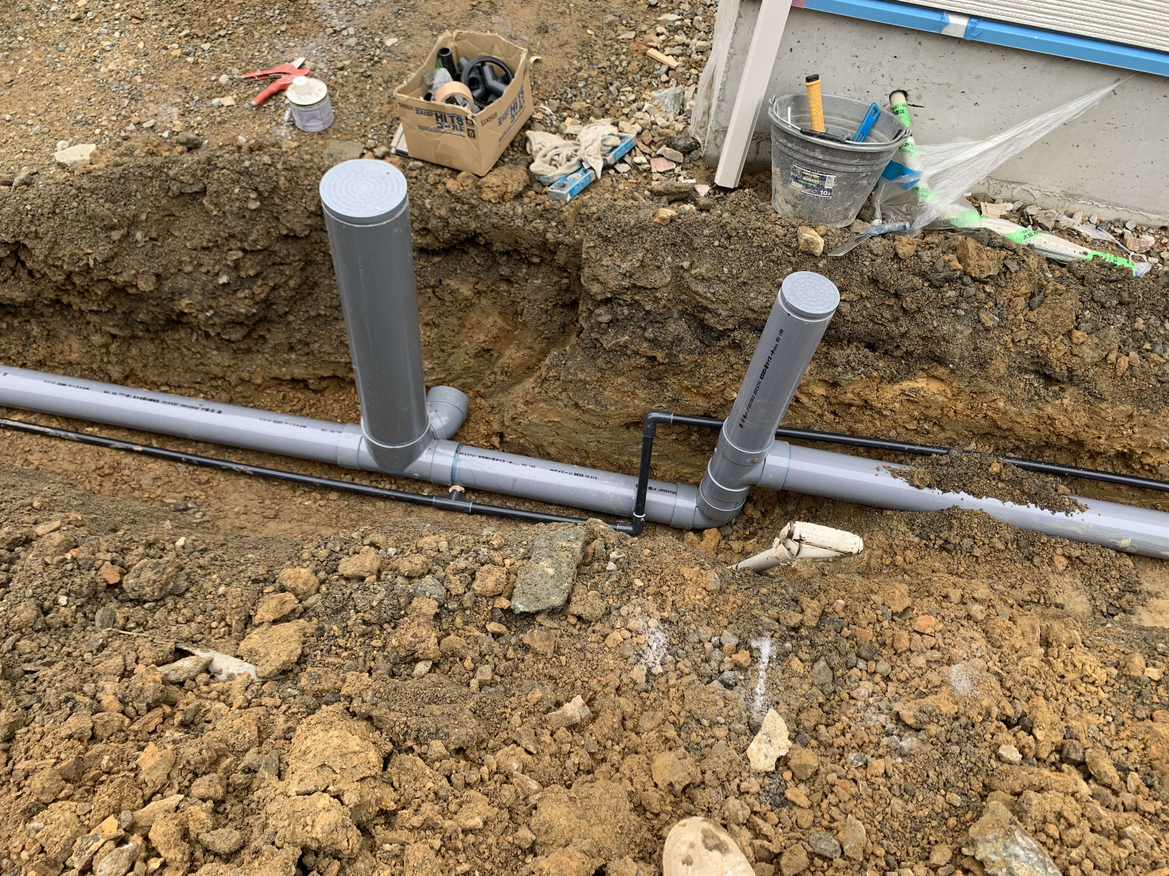 途中まで配管していた汚水の配管を最終桝に繋ぎ、雨水は側溝まで繋ぎ込みました!