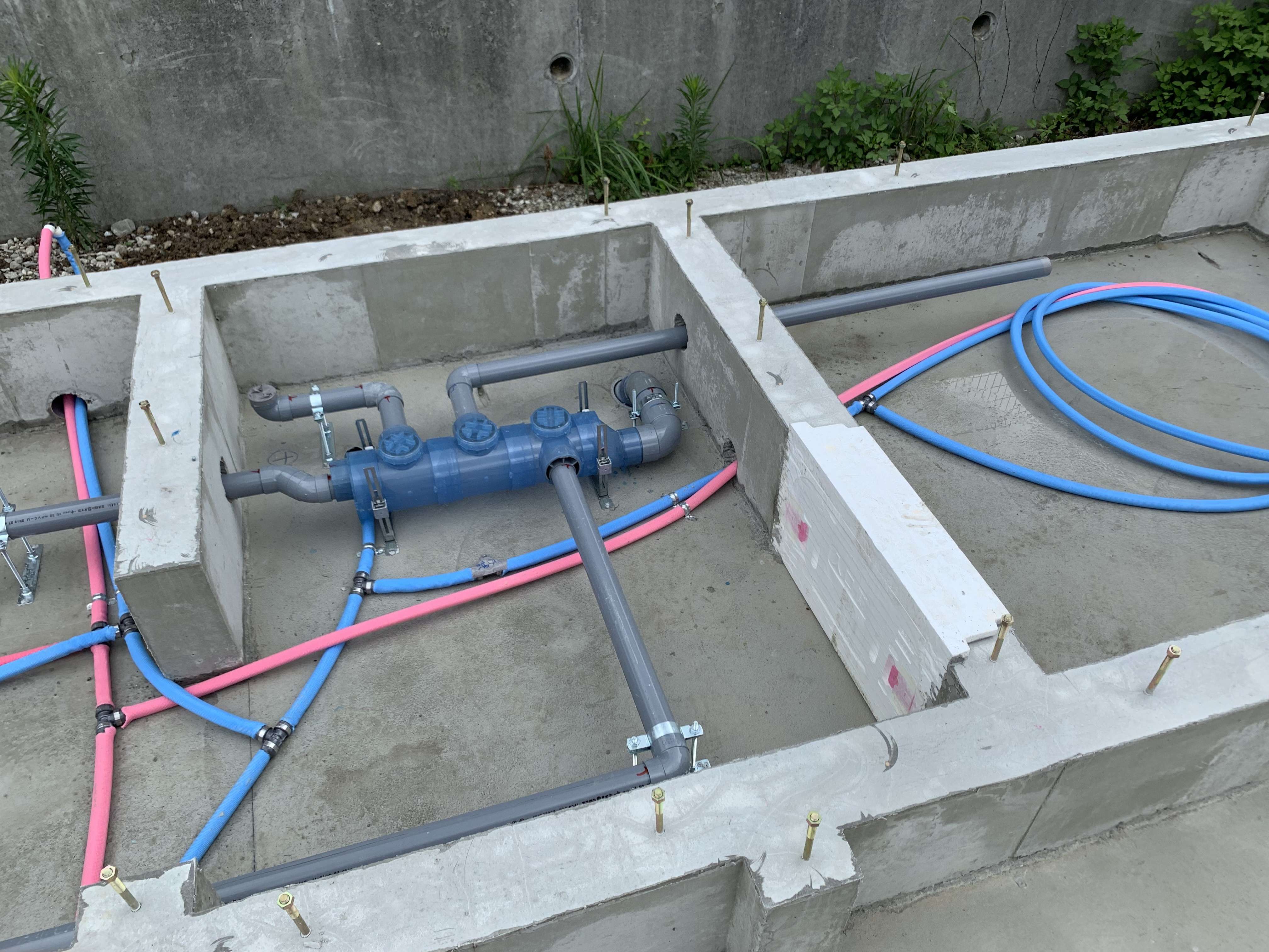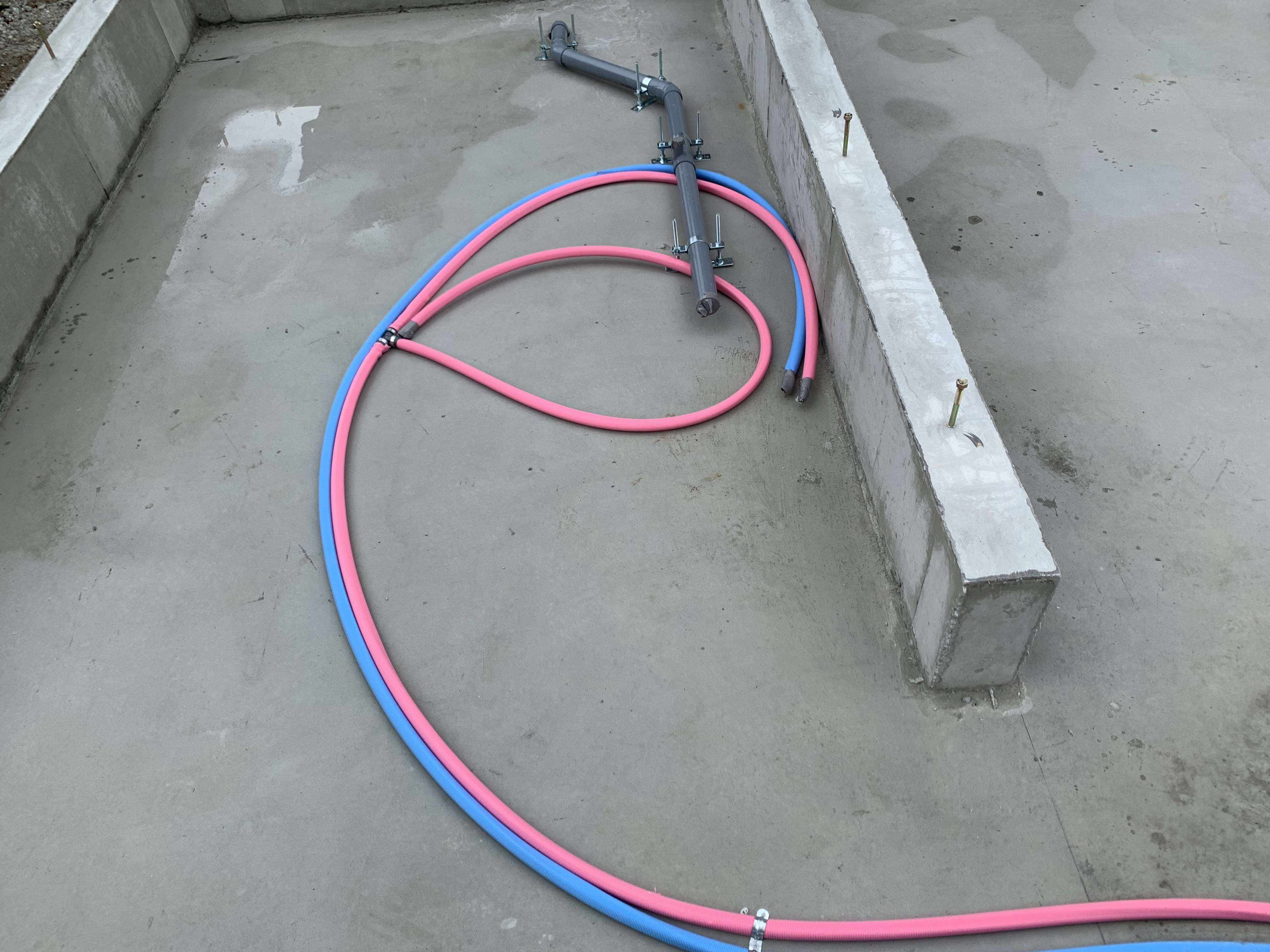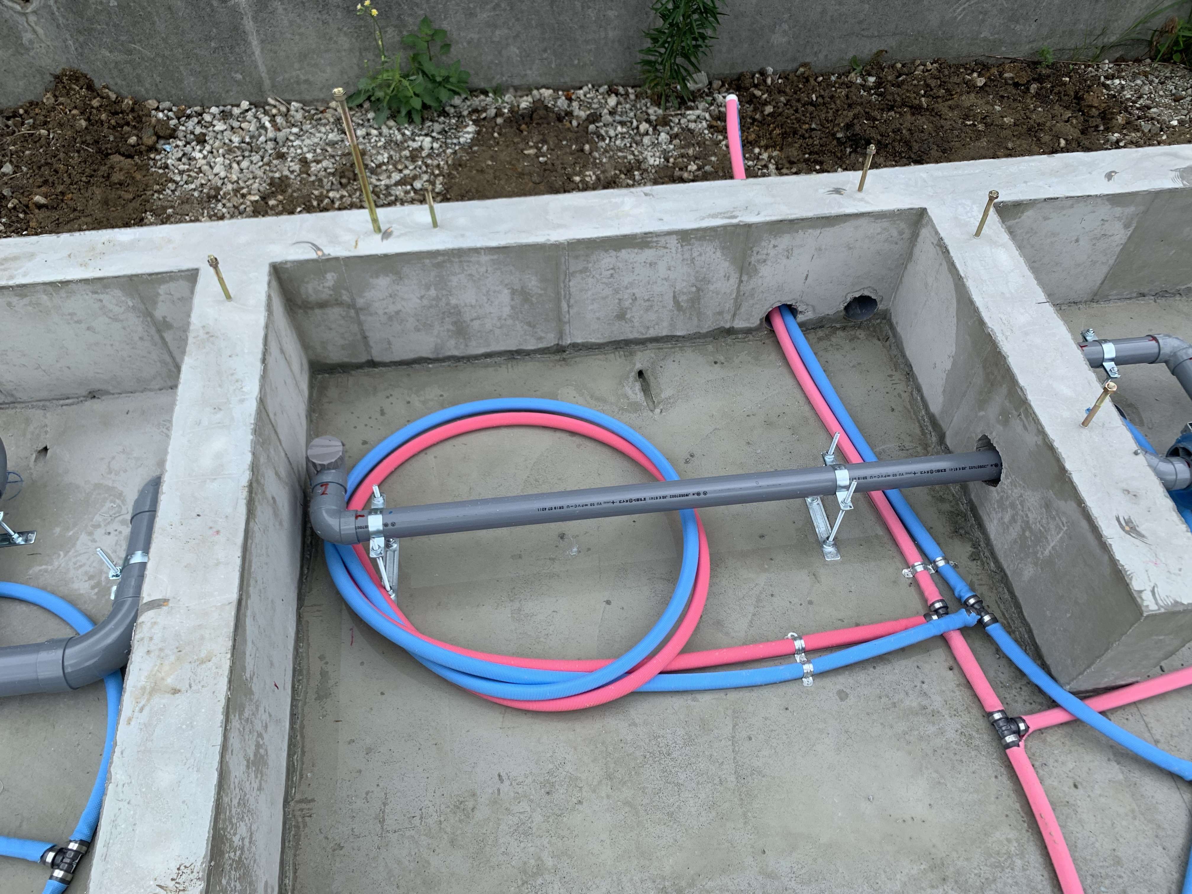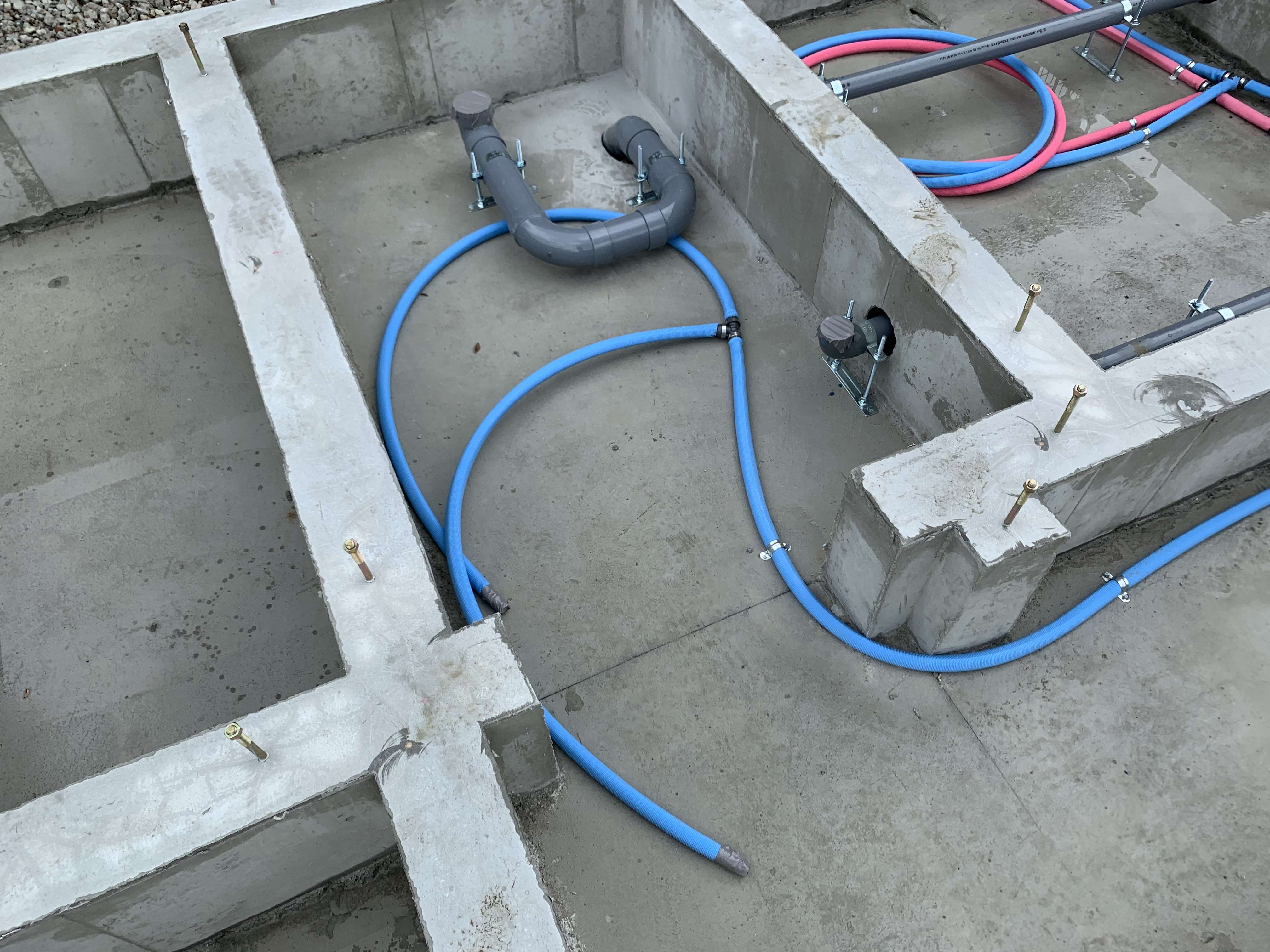 まだ基礎だけの状態ですので器具の図面を見ながら、建物が建ってから仕込みやすいようにある程度の位置まで配管しておきます。